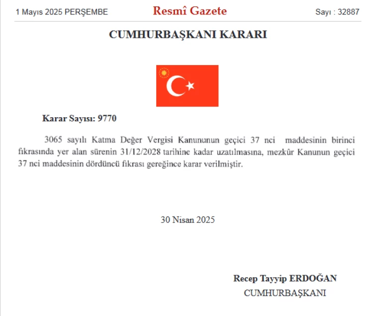 ANKARA (İGFA) - 3065 Sayılı Katma Değer Vergisi (KDV) Kanunu'nun Geçici 37'nci maddesinin birinci fıkrasında yer alan süre, 9770 sayılı Cumhurbaşkanı Kararı ile 31 Aralık 2028 tarihine kadar uzatıldı.
