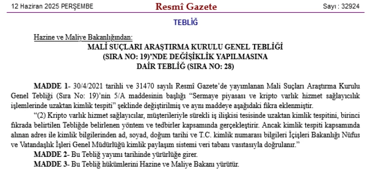 Hazine ve Maliye Bakanlığı, kripto varlık hizmet sağlayıcılarının uzaktan kimlik tespiti yapmasına olanak tanıyan düzenlemeyi kalıcı hale getirdi. Resmi Gazete'de yayımlanan tebliğ ile kimlik doğrulamada Nüfus ve Vatandaşlık İşleri Genel Müdürlüğü'nün veri tabanı kullanılacak.