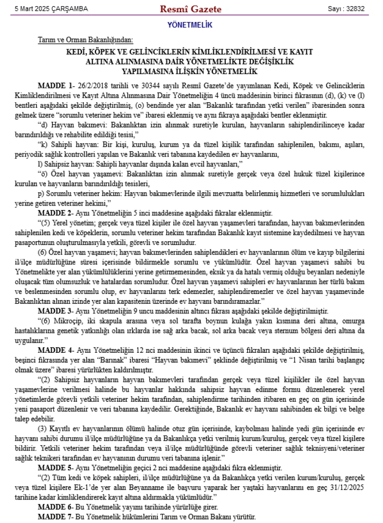 Tarım ve Orman Bakanlığı tarafından kedi ve köpeklerin kimliklendirilmesi ve kayıt altına alınmasına dair yönetmelikte değişiklik yapıldı. Kedi ve köpeklerin kimliklendirilmesi için süre 31 Aralık 2025 tarihine kadar uzatıldı.