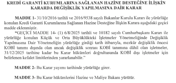Bugünkü Resmi Gazete'de yayımlanan 10329 sayılı Cumhurbaşkanı Kararı ile Kredi Garanti Kurumlarına Sağlanan Hazine Desteği Kararı'nda değişiklik yapıldı. Yeni düzenleme ile KOBİ tanımına yeni giren işletmelere kefalet limit avantajı sağlandı.