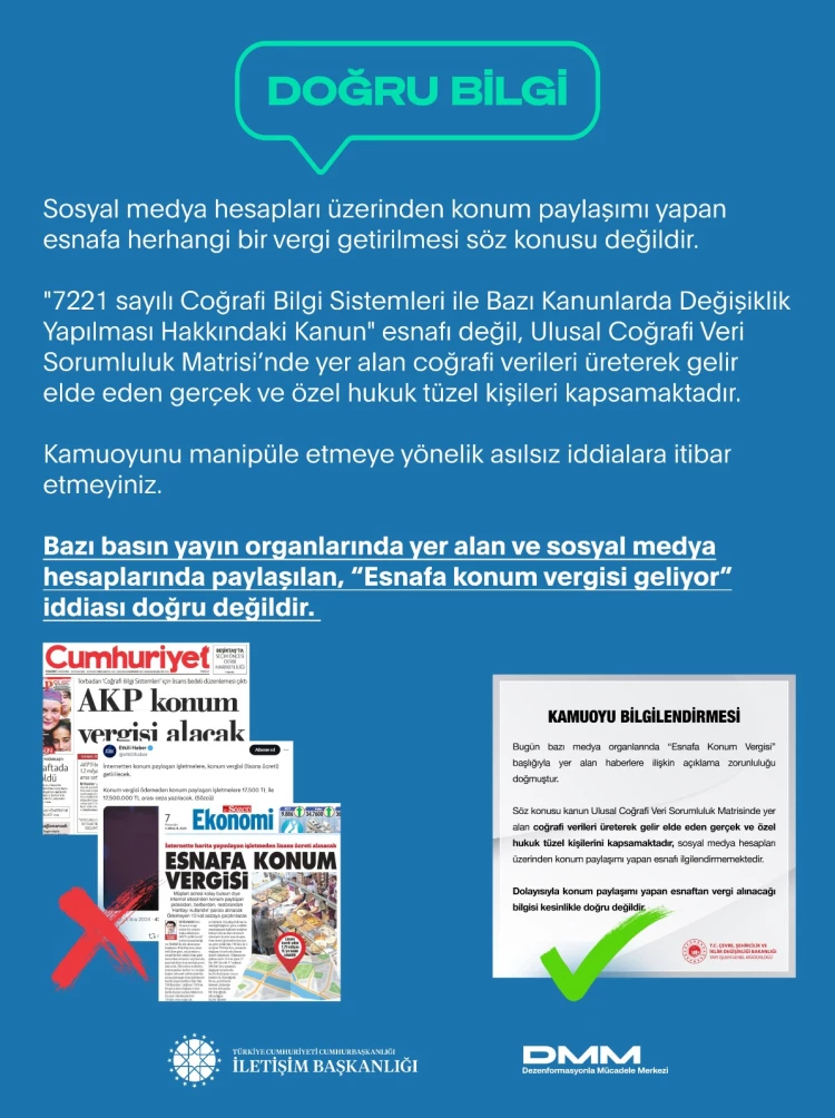 Sosyal medya hesapları üzerinden konum paylaşımı yapan esnafa herhangi bir vergi getirilmesi söz konusu olmadığının altı çizilen açıklamada, "7221 sayılı Coğrafi Bilgi Sistemleri ile Bazı Kanunlarda Değişiklik Yapılması Hakkındaki Kanun" esnafı değil Ulusal Coğrafi Veri Sorumluluk Matrisi'nde yer alan coğrafi verileri üreterek gelir elde eden gerçek ve özel hukuk tüzel kişileri kapsadığı belirtildi.