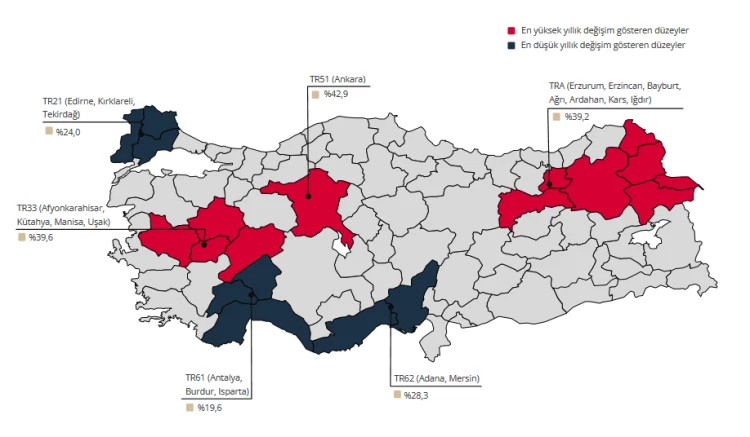 En düşük artış ise yüzde 19,6 ile Antalya, Burdur ve Isparta bölgesinde gerçekleşti.