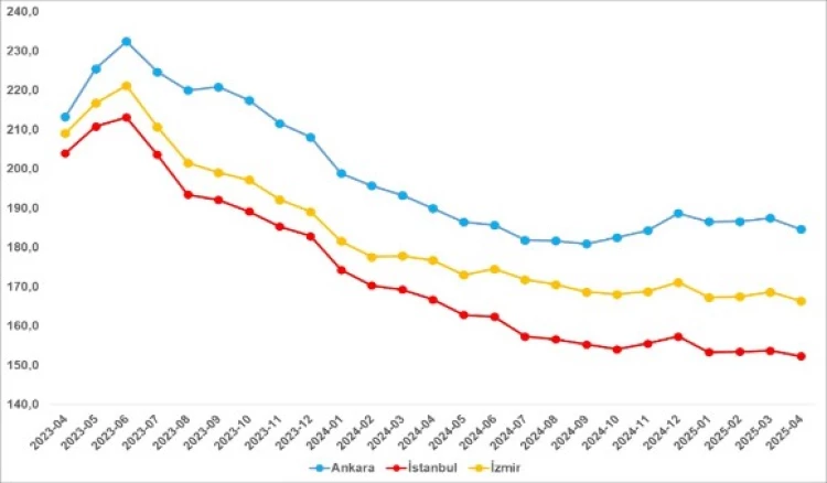 Ülke genelinde reel konut fiyat endeksi, 2023 Temmuz'dan beri düşüşte. 2024 sonlarında sınırlı artış gösteren endeks, 2025'te yeniden gerileyerek Nisan'da 154,8'e düştü. İstanbul'da 1,4 puan azalışla 152,3, Ankara'da 2,8 puan düşüşle 184,6, İzmir'de 2,2 puan gerilemeyle 166,4 olarak kaydedildi. Yıllık reel fiyat değişimi ülke genelinde -yüzde 8,9, İstanbul'da -yüzde 8,6, Ankara'da -yüzde 2,8, İzmir'de -yüzde 5,9 oldu. Cari fiyat artışı ise yüzde 25,6 seviyesinde gerçekleşti.