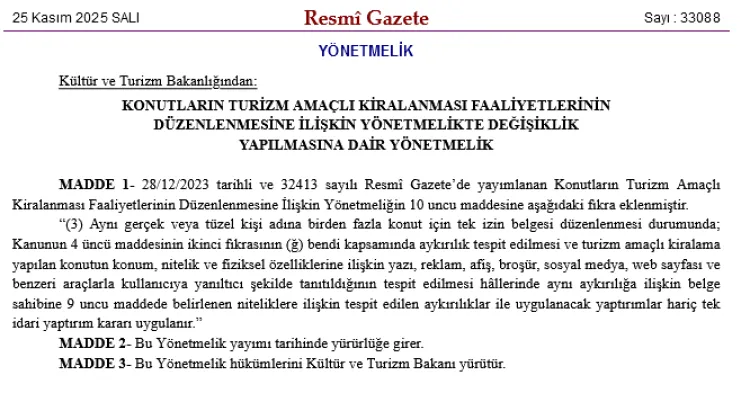 Kültür ve Turizm Bakanlığı, konutların turizm amaçlı kiralanmasına ilişkin yönetmelikte değişikliğe giderek, birden fazla konut için tek izin belgesi düzenleyenlerin sorumluluklarını netleştirdi.
