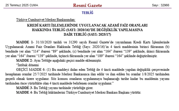 Türkiye Cumhuriyet Merkez Bankası (TCMB), kredi kartı işlemlerinde uygulanan azami faiz oranlarında değişikliğe gitti. Bugünkü Resmi Gazete'de yayımlanan tebliğ ile faiz oranlarında 25 baz puan indirim yapılırken, yeni oranlar 1 Ağustos 2025'ten itibaren geçerli olacak.