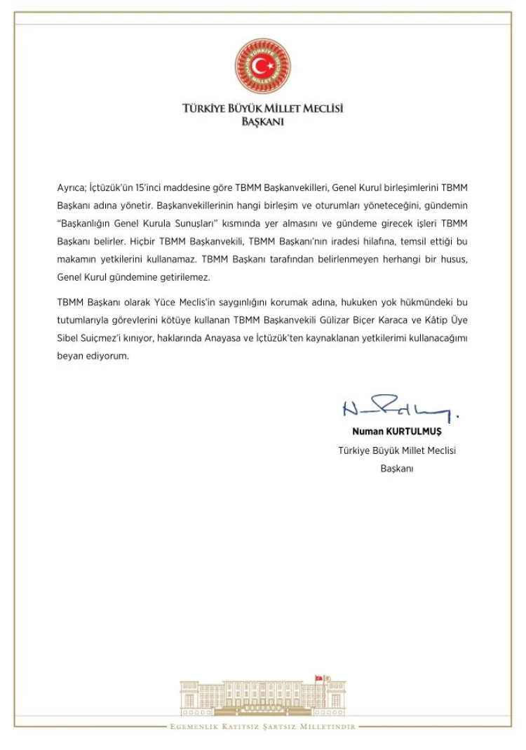 ANKARA (İGFA) - TBMM Başkanı Numan Kurtulmuş, Meclis Başkanvekili Gülizar Biçer Karaca'nın, TBMM Genel Kurulunda Anayasa Mahkemesinin (AYM), Gezi Parkı davası hükümlüsü ve milletvekilliği düşürülen Can Atalay ile ilgili karar hükmünü okutmasına ilişkin, "TBMM Başkanvekili Gülizar Biçer Karaca'nın Anayasa'ya, İçtüzük'e ve teamüllere aykırı olarak bir metni katip üyeye okutması hem yetki aşımı hem de hukuken yok hükmündedir." ifadesini kullandı.