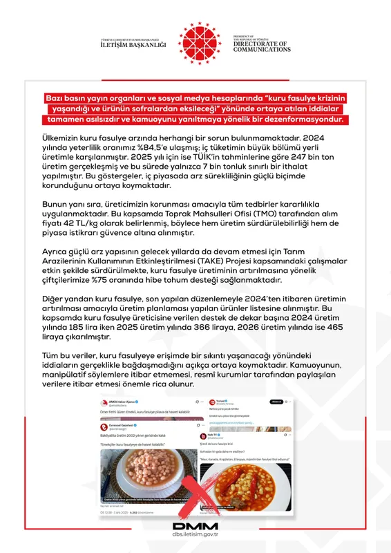 İletişim Başkanlığı Dezenformasyonla Mücadele Merkezi (DMM), bazı medya organlarında yer alan "kuru fasulyenin sofralardan eksileceği" yönündeki haberlerin gerçeği yansıtmadığını duyurdu.