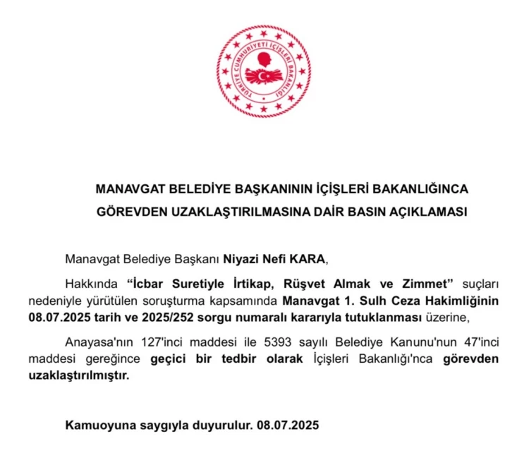 İçişleri Bakanlığı, Manavgat Belediye Başkanı Niyazi Nefi Kara'nın rüşvet, irtikap ve zimmet suçlamalarıyla tutuklanması üzerine görevden uzaklaştırıldığını duyurdu.