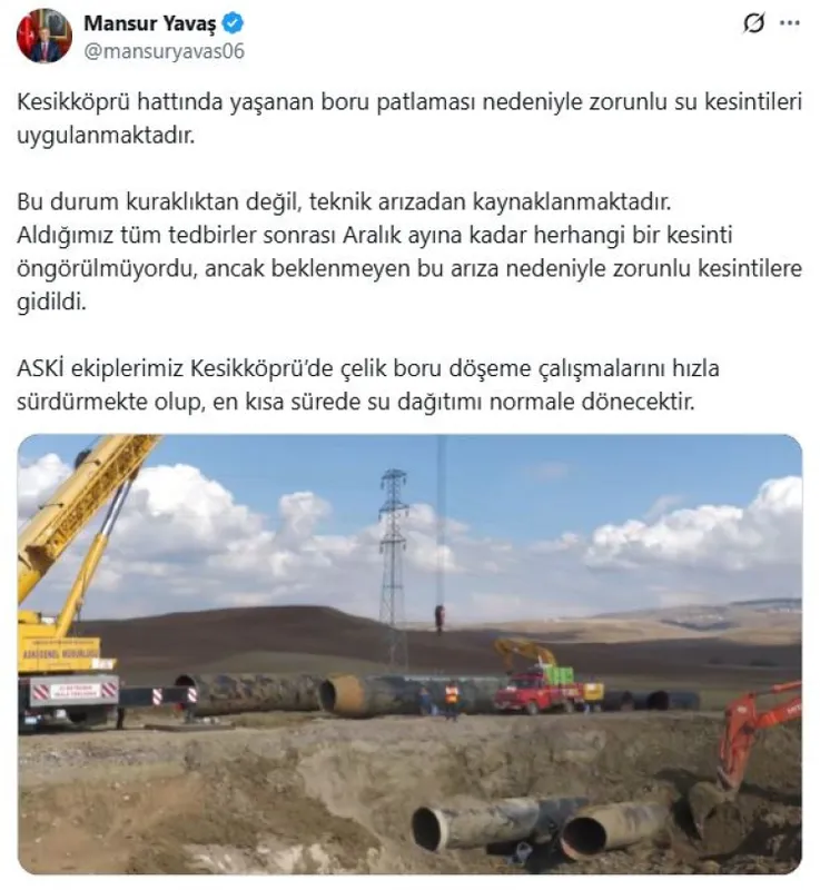 Sosyal medya üzerinden de konuya ilişkin açıklama yapan Mansur Yavaş, "Kesikköprü hattında yaşanan boru patlaması nedeniyle zorunlu su kesintileri uygulanmaktadır. Bu durum kuraklıktan değil, teknik arızadan kaynaklanmaktadır. Aldığımız tüm tedbirler sonrası aralık ayına kadar herhangi bir kesinti öngörülmüyordu, ancak beklenmeyen bu arıza nedeniyle zorunlu kesintilere gidildi. ASKİ ekiplerimiz Kesikköprü'de çelik boru döşeme çalışmalarını hızla sürdürmekte olup en kısa sürede su dağıtımı normale dönecektir" ifadelerini kullandı.