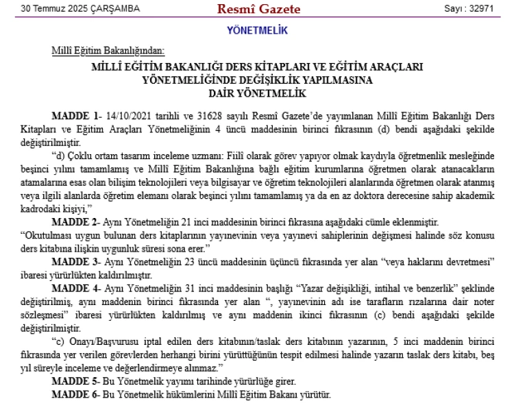 30 Temmuz 2025 tarihli Resmi Gazete'de yayımlanan yönetmelikle, Milli Eğitim Bakanlığı Ders Kitapları ve Eğitim Araçları Yönetmeliği'nde çoklu ortam uzmanı tanımı, yayınevi değişiklikleri ve yazar intihali gibi konularda düzenlemeler yapıldı