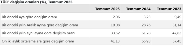 TÜİK verilerine göre, Temmuz 2025'te Tüketici Fiyat Endeksi'nin (TÜFE) yıllık yüzde 33,52, aylık yüzde 2,06 artış gösterdiğini açıkladı. Gıda ve alkolsüz içeceklerde yıllık artış yüzde 27,95, konutta yüzde 62,01, ulaştırmada yüzde 26,57 olurken özel kapsamlı TÜFE (B) ise yıllık yüzde 33,77, aylık yüzde 1,82 yükseldi.