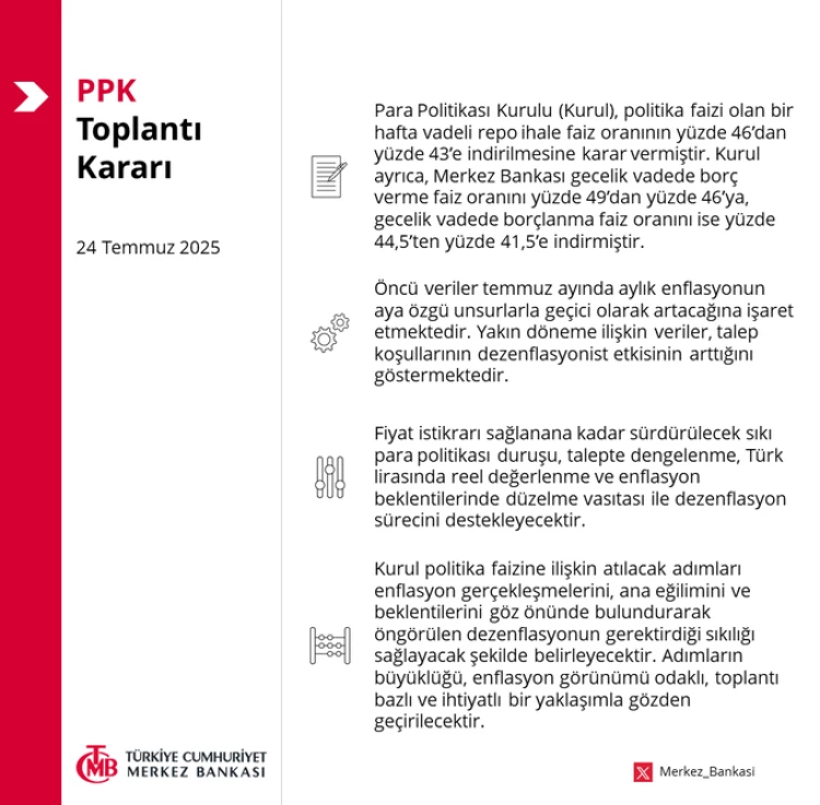 Kurul, politika faizi olan bir hafta vadeli repo ihale faiz oranının yüzde 46'dan yüzde 43'e indirilmesine karar verdi.