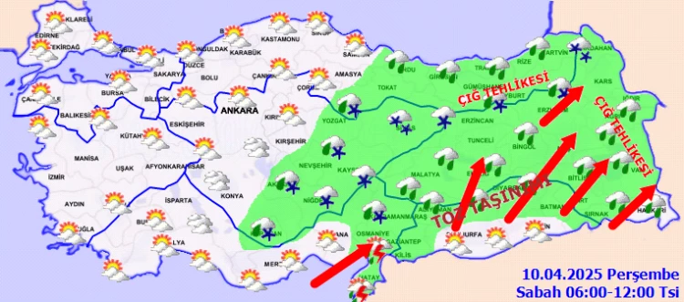 Yağışların yağmur ve sağanak, Güney kesimlerde yer yer gök gürültülü sağanak, Batı Karadeniz'in iç kesimleri, İç Anadolu'nun doğusu, Doğu Anadolu'nun kuzeydoğusu ile Bilecik, Kütahya, Eskişehir ve Ankara çevrelerinde karla karışık yağmur ve kar şeklinde görülmesi beklenen yağışların gece saatlerinden sonra Batı Karadeniz ile Sakarya çevrelerinde yerel kuvvetli olması bekleniyor. Rüzgarın, Doğu Anadolu'nun doğusu, Güneydoğu Anadolu ile Elazığ ve Hatay çevrelerinde kuvvetli rüzgar ve fırtına (50-80 km/saat, yükseklerinde 90 km/saat) şeklinde eseceği tahmin ediliyor. Doğu Anadolu'nun güneydoğusu ve Güneydoğu Anadolu bölgesinde toz taşınımı bekleniyor.