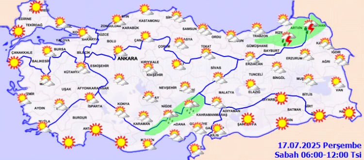 Meteoroloji Genel Müdürlüğü'nün 17 Temmuz 2025 tarihli verilerine göre, Türkiye'nin kuzeydoğu, iç ve güney kesimlerinde parçalı ve yer yer çok bulutlu bir hava hakim olacak.