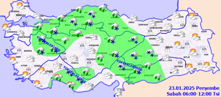 ANKARA (İGFA) -Meteoroloji Genel Müdürlüğü 23 Ocak Perşembe gününe ilişkin günlük hava tahmin raporunu yayımladı.