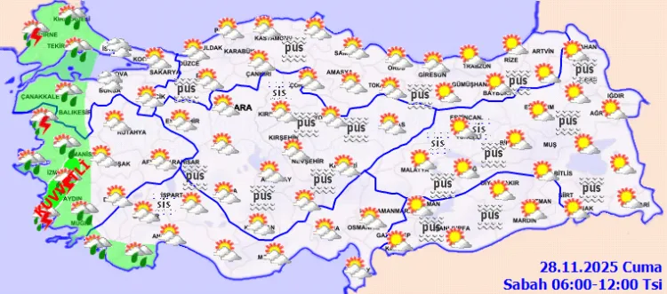 Yağışların, Kıyı Ege ile Çanakkale, Edirne, Balıkesir ve Manisa çevrelerinde yer yer kuvvetli olması bekleniyor. İç kesimlerde sabah ve gece saatlerinde pus ve yer yer sis hadisesi olacağı tahmin ediliyor.