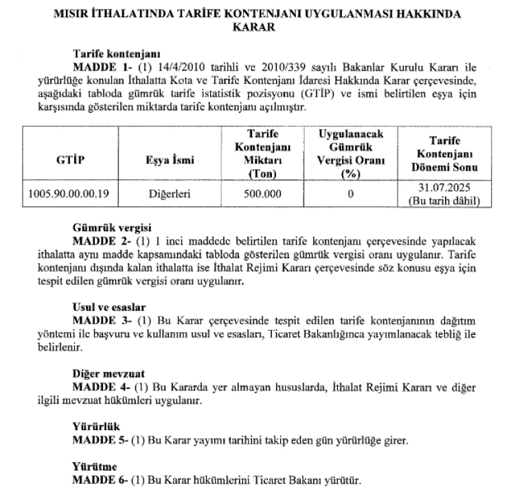 Cumhurbaşkanı Recep Tayyip Erdoğan'ın imzasını taşıyan karar, 31 Temmuz 2025 tarihine kadar 500 bin ton mısır ithalatı için tarife kontenjanı açılmasını öngörüyor.