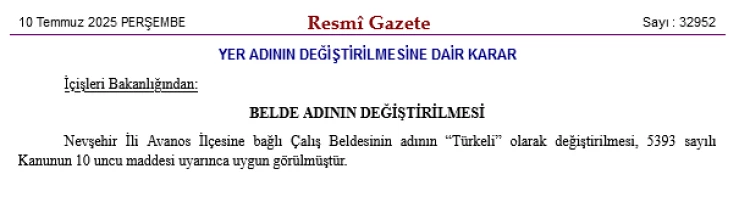 ANKARA (İGFA) - İçişleri Bakanlığı tarafından, Nevşehir'in Avanos ilçesine bağlı Çalış Beldesi'nin adının "Türkeli" olarak değiştirilmesine dair karar, Resmi Gazete'de yayımlanarak yürürlüğe girdi.