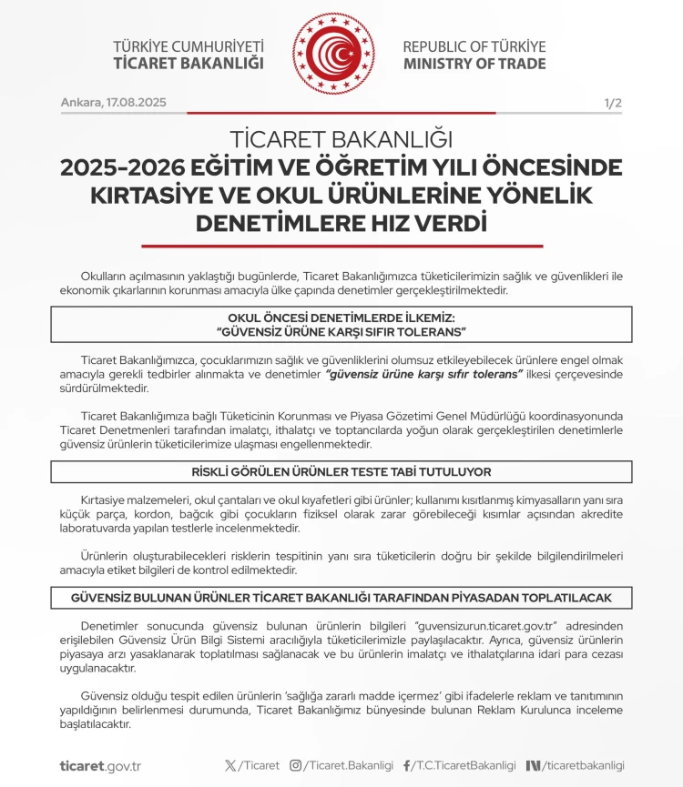 Ticaret Bakanlığı, 2025-2026 eğitim-öğretim yılı öncesi kırtasiye, okul çantası ve kıyafetlerine yönelik denetimlerini hızlandırdı. "Güvensiz ürüne sıfır tolerans" ilkesiyle hareket eden Bakanlık, çocukların sağlığını ve tüketicilerin ekonomik çıkarlarını korumak için ülke genelinde yoğun kontroller gerçekleştiriyor.