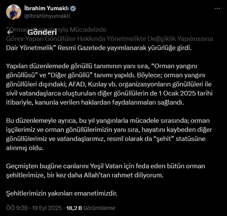 Orman Yangınlarıyla Mücadelede Görev Yapan Gönüllüler Hakkında Yönetmelik'te değişiklik yapıldı. Orman yangınlarıyla mücadelede görev alan gönüllülerin hakları güçlendirilirken, tanımları da netleşti. Bu yıl yangınlarda hayatını kaybeden orman işçileri, gönüllüler ve diğer vatandaşlar da resmi olarak "şehit" statüsüne alındı.