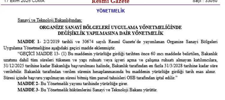 Sanayi ve Teknoloji Bakanlığı, Organize Sanayi Bölgeleri Uygulama Yönetmeliği'nde değişikliğe giderek, ruhsat almayan katılımcılara yeni bir süre tanıdı. Yıl sonuna kadar başvurusunu yapanlara 31 Mart 2028'e kadar ek süre verilebilecek.