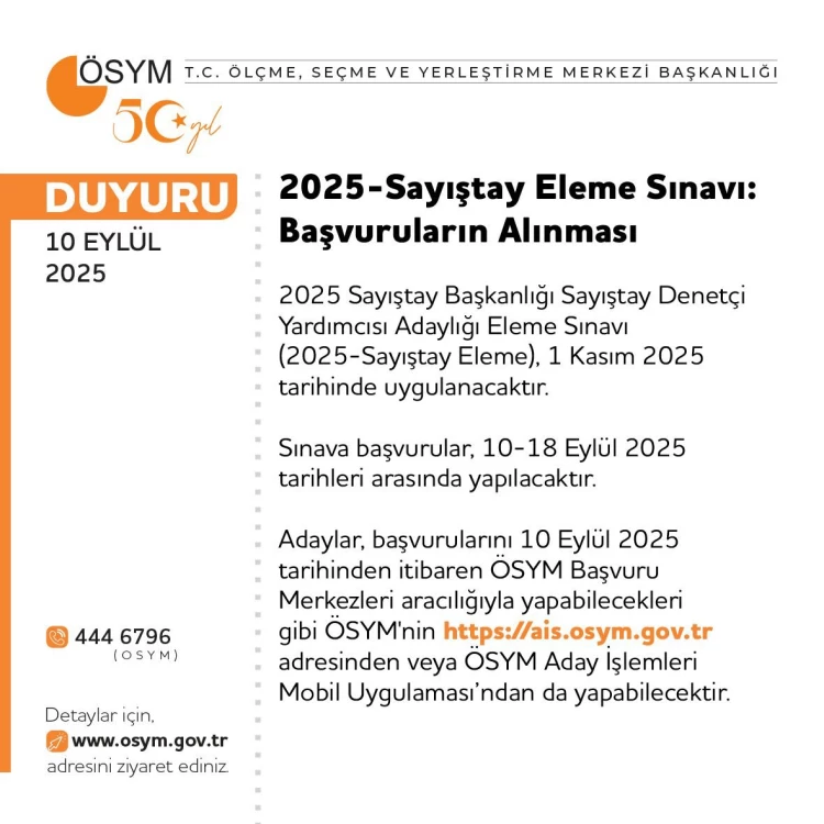 2025-Sayıştay Eleme Sınavı, 1 Kasım 2025'te gerçekleştirilecek. Başvurular, 10 Eylül 2025 saat 11:15'ten itibaren 18 Eylül'e kadar ÖSYM Başvuru Merkezleri, https://ais.osym.gov.tr adresi veya ÖSYM Aday İşlemleri Mobil Uygulaması üzerinden yapılabilecek. Adayların, sınav kılavuzunu dikkatle incelemeleri gerektiği vurgulandı.
