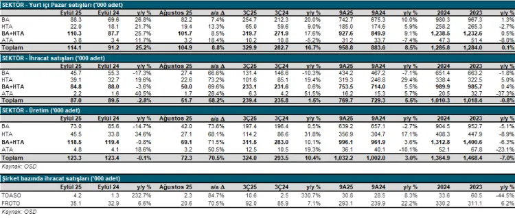Tofaş'ın Eylül ayında ihracatı geçen yıla göre 1,3 bin adetten 4,2 bin adede yükselirke, 2025 için 70-90 bin adetlik ihracat tahmini, K0 modelinin üretim artışına rağmen 70-80 bin adede düşürüldü. Ford Otosan ihracatı yüzde 6,6 artarak 35,1 bin adede ulaştı.