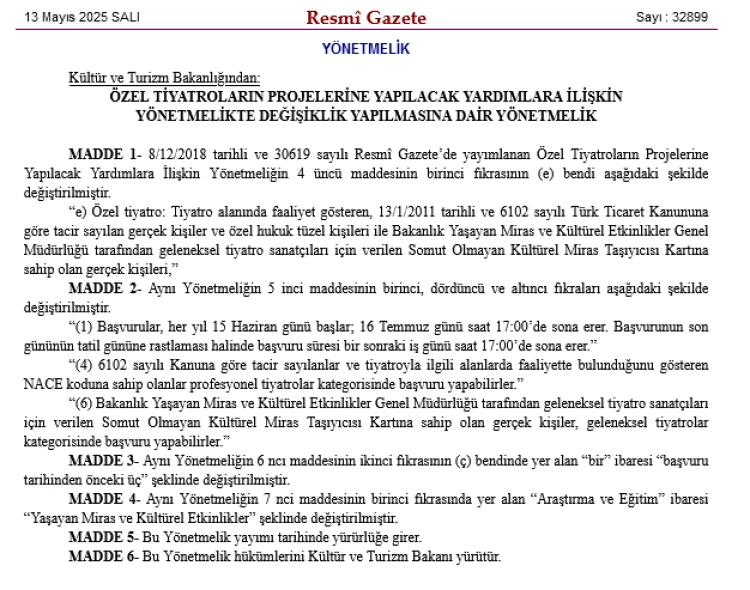 Bugünkü Resmi Gazete'de yayımlanan yeni düzenlemeyle, özel tiyatro tanımı genişletildi. Bundan böyle 6102 sayılı Türk Ticaret Kanunu'na göre tacir sayılanlar ve Bakanlık tarafından verilen Somut Olmayan Kültürel Miras Taşıyıcısı Kartı'na sahip geleneksel tiyatro sanatçıları da destek kapsamına alındı.