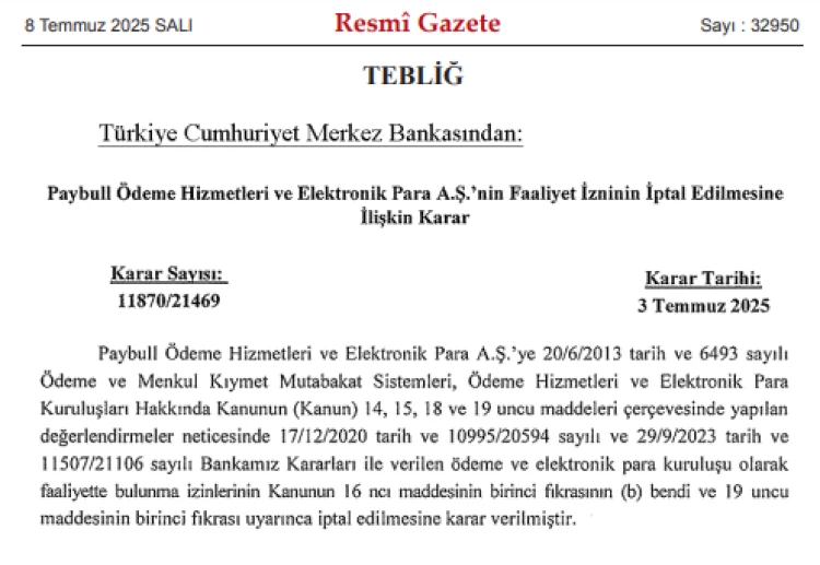 Türkiye Cumhuriyet Merkez Bankası, Paybull Ödeme Hizmetleri ve Elektronik Para A.Ş.'nin faaliyet iznini iptal etti. Karar, bugünkü Resmi Gazete'de yayımlandı.