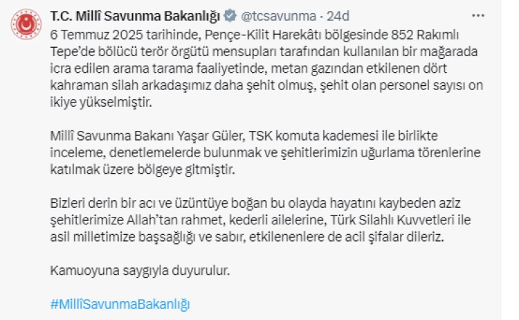 ANKARA (İGFA) - Milli Savunma Bakanlığı, 6 Temmuz 2025 tarihinde Pençe-Kilit Harekâtı bölgesinde, 852 Rakımlı Tepe'de teröristler tarafından kullanılan bir mağarada gerçekleştirilen arama-tarama faaliyetinde metan gazından etkilenen 7 askerin daha şehit olduğunu duyurdu. Böylece bölgedeki toplam şehit sayısı 12'ye yükseldi. Bakanlık, olayın tüm ülkeyi derin bir acı ve üzüntüye boğduğunu ifade etti.