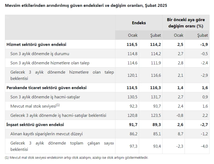 TÜİK'in açıkladığı Şubat ayı verilerine göre, hizmet ve inşaat sektöründe güven azalırken, perakende ticaretin güven endeksi arttı.