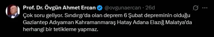 Balıkesir'in Sındırgı ilçesinde meydana gelen 6.1 büyüklüğündeki depremin ardından Jeofizik Yüksek Mühendisi Prof. Dr. Övgün Ahmet Ercan, Halk TV ve Sözcü TV yayınlarında yaptığı değerlendirmelerde ve sosyal medya paylaşımında, depremle ilgili dikkat çeken açıklamalarda bulundu.