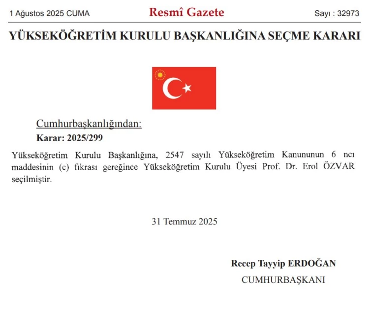 Bugünkü Resmi Gazete'de yayımlanan kararlarla, Prof. Dr. Erol Özvar, Yükseköğretim Kurulu (YÖK) Üyeliğine ve YÖK Başkanlığına yeniden seçildi. Cumhurbaşkanı Recep Tayyip Erdoğan'ın imzasıyla yürürlüğe giren kararlar, Özvar'ın 2021'den beri sürdürdüğü başkanlık görevini devam ettireceğini duyurdu.