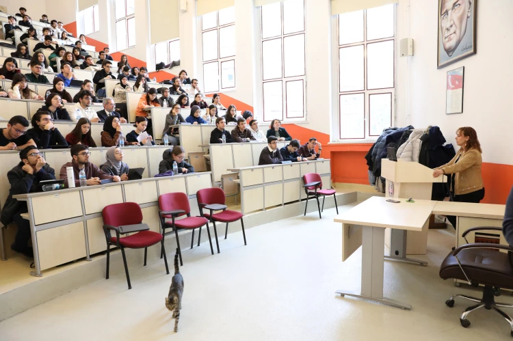 Prof. Dr. Güvem Gümüş Akay, dersin başında yaptığı konuşmada, öğrencilerin büyük bir şansa sahip olduğunu belirterek, "Ne öğrenciliğimde ne de asistanlığımda rektörle bir araya gelme fırsatım oldu. Rektör Hocamızın şu anda sizlerle birlikte dersi dinlemesi gerçekten özel bir an" ifadelerini kullandı.