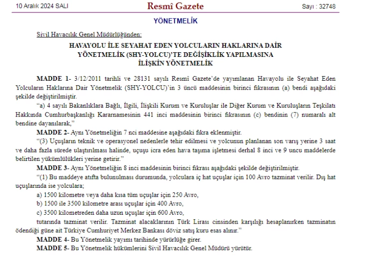 ANKARA (İGFA) - Hava Yolu ile Seyahat Eden Yolcuların Haklarına Dair Yönetmelik (SHY-YOLCU) üzerinde yapılan değişiklikler bugünkü Resmî Gazete'de yayımlanarak yürürlüğe girdi.