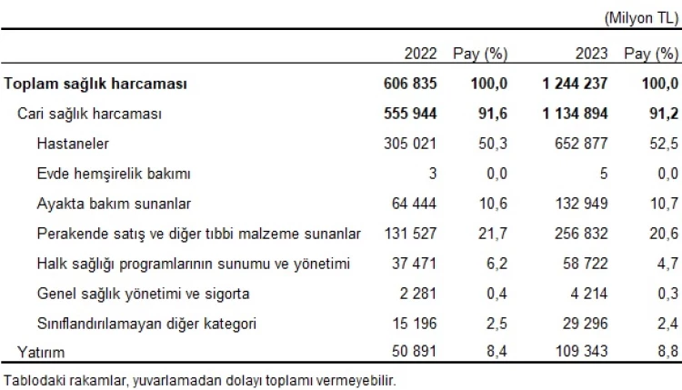 Toplam sağlık harcaması 2023 yılında bir önceki yıla göre yüzde 105 artarak 1 trilyon 244 milyar 237 milyon TL'ye yükselirken, genel devlet sağlık harcaması yüzde 108,1 artarak 964 milyar 355 milyon TL'ye ulaştı. Özel sektör sağlık harcaması ise yüzde 95,3'lük bir artış oranı ile 279 milyar 883 milyon TL olarak tahmin edildi.
