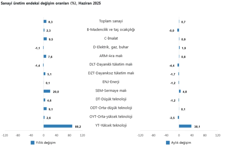 Türkiye İstatistik Kurumu (TÜİK), 2025 yılı Haziran ayına ilişkin Sanayi Üretim Endeksi verilerini yayımladı. Sanayi üretimi yıllık bazda yüzde 8,3, aylık bazda ise yüzde 0,7 artış gösterdi. İmalat sanayi büyürken, madencilik ve taş ocakçılığı sektöründe aylık düşüş dikkat çekti.