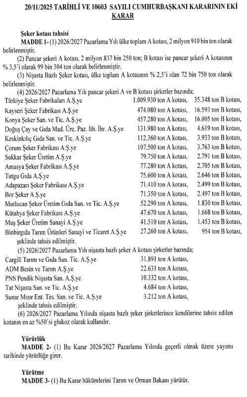 Kararda ayrıca, pancar şekeri üretiminde faaliyet gösteren şirketlere tahsis edilen A ve B kotaları ile NBŞ üretim kotası detayları da yer aldı.