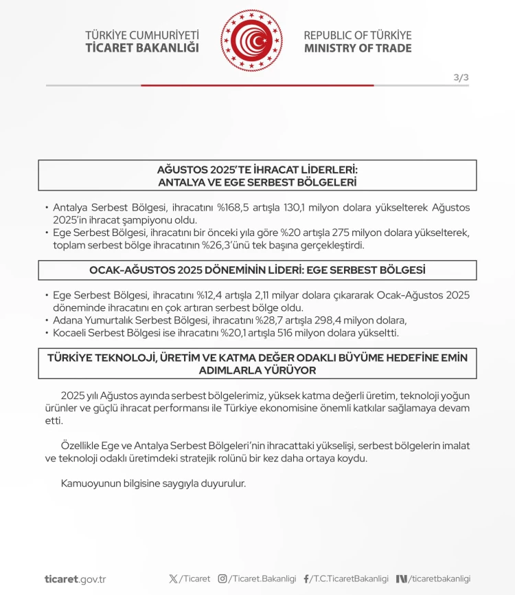 Ege Serbest Bölgesi: yüzde 20 artışla 275 milyon dolar ihracat yaptı; Ocak-Ağustos'ta yüzde 12,4 artışla 2,11 milyar dolarla liderliğini sürdürdü. Toplam ticaret hacmi 3,98 milyar dolar.