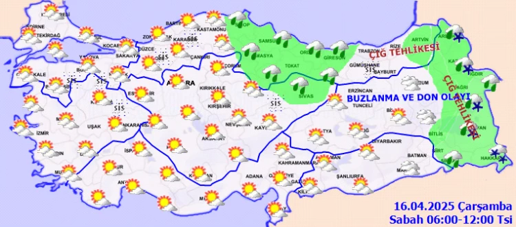 Sabah ve gece saatlerinde Marmara'nın güney ve doğusu, Batı Karadeniz, İç Anadolu ve Doğu Anadolu'nun batısında pus ve sis etkili olacak. İç ve doğu kesimlerde ise sabah ve gece saatlerinde buzlanma ve don olaylarına karşı dikkatli olunması gerekiyor. Ayrıca, Doğu Karadeniz'in iç kesimlerinin yüksek bölgeleri ile Doğu Anadolu'nun eğimli ve yüksek alanlarında çığ tehlikesi bulunuyor.