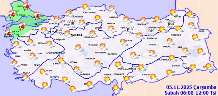 Marmara'nın güneyi ile Karadeniz'in iç kesimlerinde gece ve sabah saatlerinde pus ve yer yer sis etkili olacak.