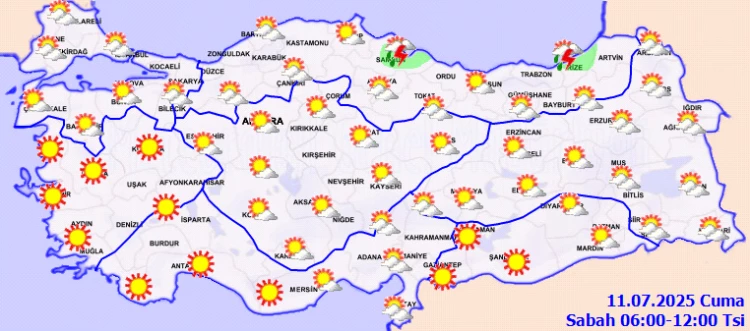 ANKARA (İGFA) - Meteoroloji Genel Müdürlüğü 11 Temmuz Cuma gününe ilişkin hava tahmin raporunu yayımladı. Meteoroloji Genel Müdürlüğü tarafından yapılan tahminlere göre, yurdun kuzey kesimlerinin parçalı, yer yer çok bulutlu, Samsun, Rize, Artvin, Kars ve Ardahan ile Van'ın doğu kesimlerinin yerel olmak üzere sağanak ve gök gürültülü sağanak yağışlı, diğer yerlerin az bulutlu ve açık geçeceği tahmin ediliyor.