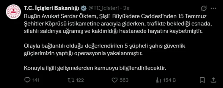 İçişleri Bakanlığı, Sinan Ateş davası sanıklarından Avukat Serdar Öktem'in Şişli Büyükdere Caddesi'nde trafikte beklerken silahlı saldırıya uğradığını ve hastanede vefat ettiğini duyurdu. Olayla bağlantılı 5 şüpheli yakalanırken, soruşturma sürüyor.