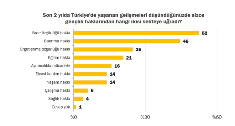 Rapor, gençlik hakları bağlamında ifade özgürlüğü, barınma hakkı ve örgütlenme özgürlüğü gibi temel hakların gençler için giderek daha erişilmez hale geldiğini ortaya koyuyor. Ekonomik kriz, sivil alanın daralması ve siyasi baskılar gençlik örgütlerinin faaliyet alanını kısıtlıyor. Kayyum atamaları ve tasarruf tedbirleri gençlik çalışmalarını doğrudan etkilerken fon sağlayıcı kuruluşların esneklik göstermemesi örgütlerin varlığını sürdürmesini zorlaştırıyor.