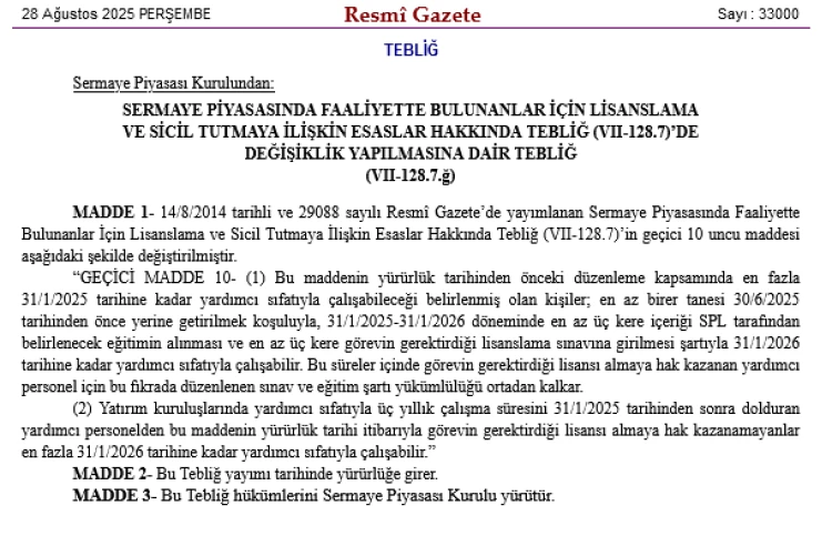 Sermaye Piyasası Kurulu (SPK), 28 Ağustos 2025 tarihli Resmi Gazete'de yayımlanan tebliğ ile lisanslama ve sicil tutma esaslarında değişiklik yaptı. Yatırım kuruluşlarında yardımcı sıfatıyla çalışan personelin lisans alma süresi 31 Ocak 2026'ya uzatıldı.