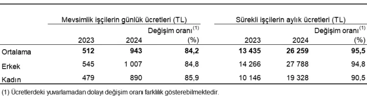 Tarımsal işletmelerde 2024 yılında mevsimlik tarım işçilerinin günlük ücretleri bir önceki yıla göre yüzde 84,2 artarak 943 TL, sürekli tarım işçilerinin aylık ücretleri ise yüzde 95,5 artarak 26 bin 259 TL oldu.