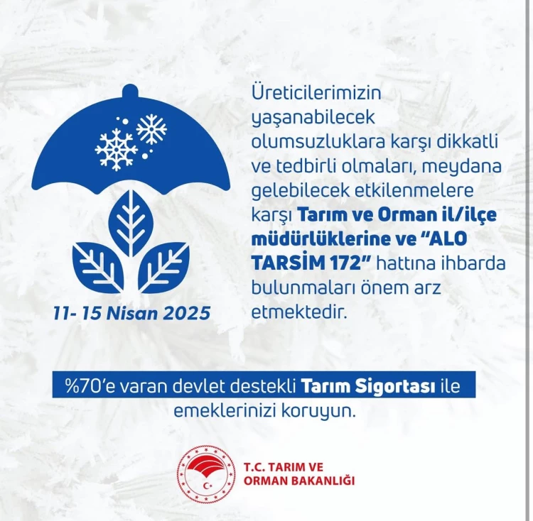 Yapılan açıklamada, zirai don, dolu, şiddetli yağış, sel, su baskını ve fırtına gibi hava olaylarına karşı çiftçilerin dikkatli ve tedbirli olması gerektiğine dikkati çekilerek, olası olumsuzluklarda, Tarım ve Orman İl/İlçe Müdürlükleri ile "ALO TARSİM 172" hattına ihbarda bulunulmasının önemine dikkati çekildi.