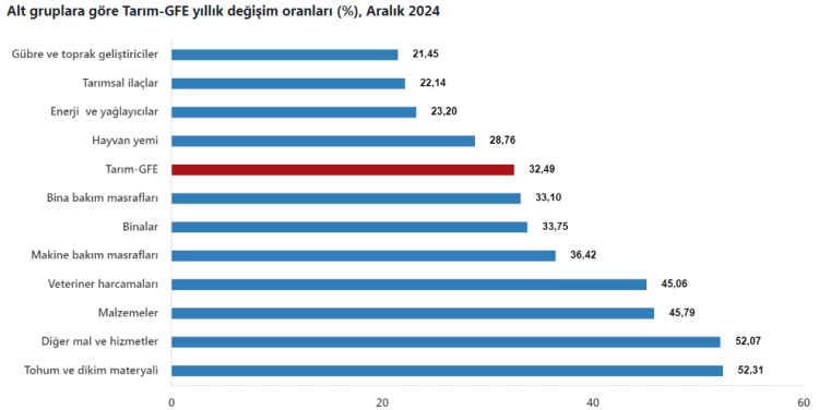 TÜİK'in açıkladığı Aralık ayı verilerine göre Tarım-GFE 12 aylık dönemde yüzde 40,94 artış gösterdi. Yıllık değişimde en yüksek girdi tohum ve dikim materyali grubunda yaşandı.