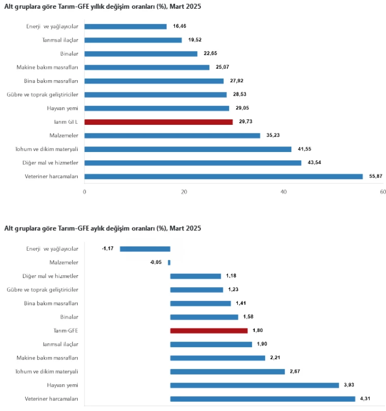 Türkiye İstatistik Kurumu (TÜİK), Mart 2025 Tarımsal Girdi Fiyat Endeksi'ni (Tarım-GFE) açıkladı. Endeks, bir önceki aya göre yüzde 1,80, geçen yılın aynı ayına göre ise yüzde 29,73 artış gösterdi.