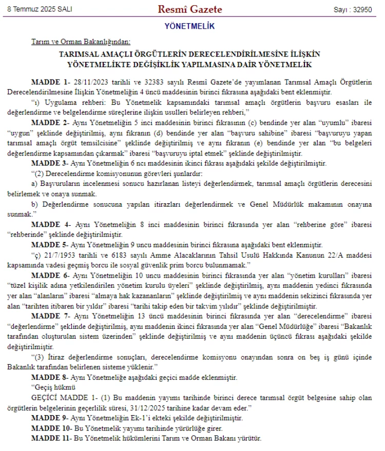 Yeni düzenlemeler, tarımsal örgütlerin derecelendirme süreçlerini ve belgelerinin geçerlilik sürelerini kapsadı.